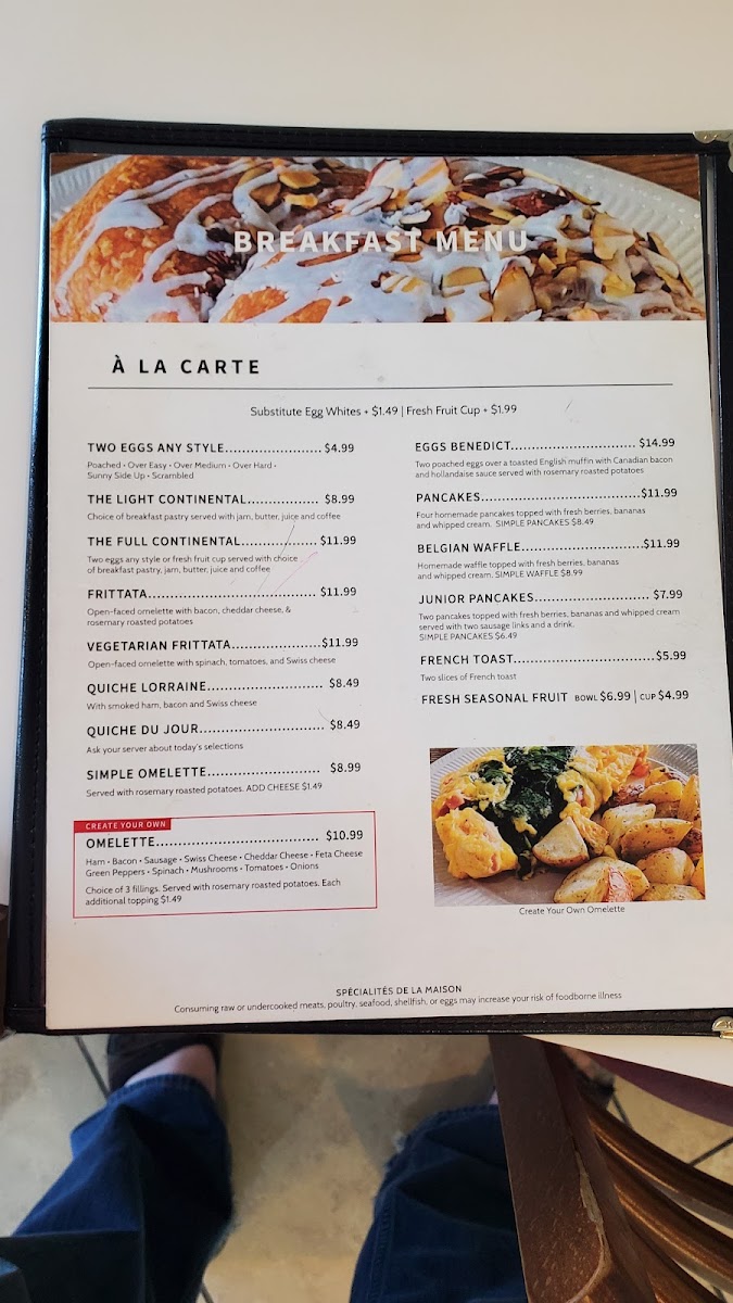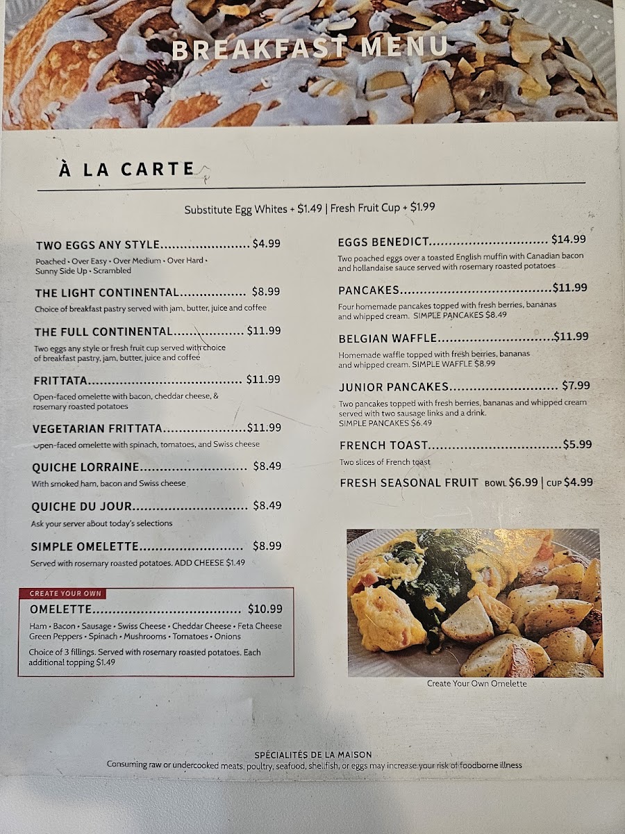 Entrées: The savory offerings include classic French-inspired dishes like Quiche Lorraine with smoked ham, bacon, and Swiss cheese, daily quiche specials served with vegetable du jour, Croque Monsieur sandwiches made with grilled ham, Swiss cheese, dijon mustard, and béchamel sauce, as well as Croissant Au Jambon Et Fromage featuring ham and Swiss cheese on buttery croissants.