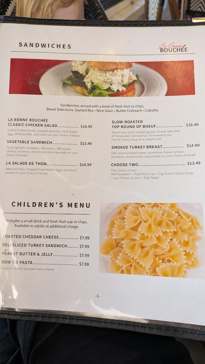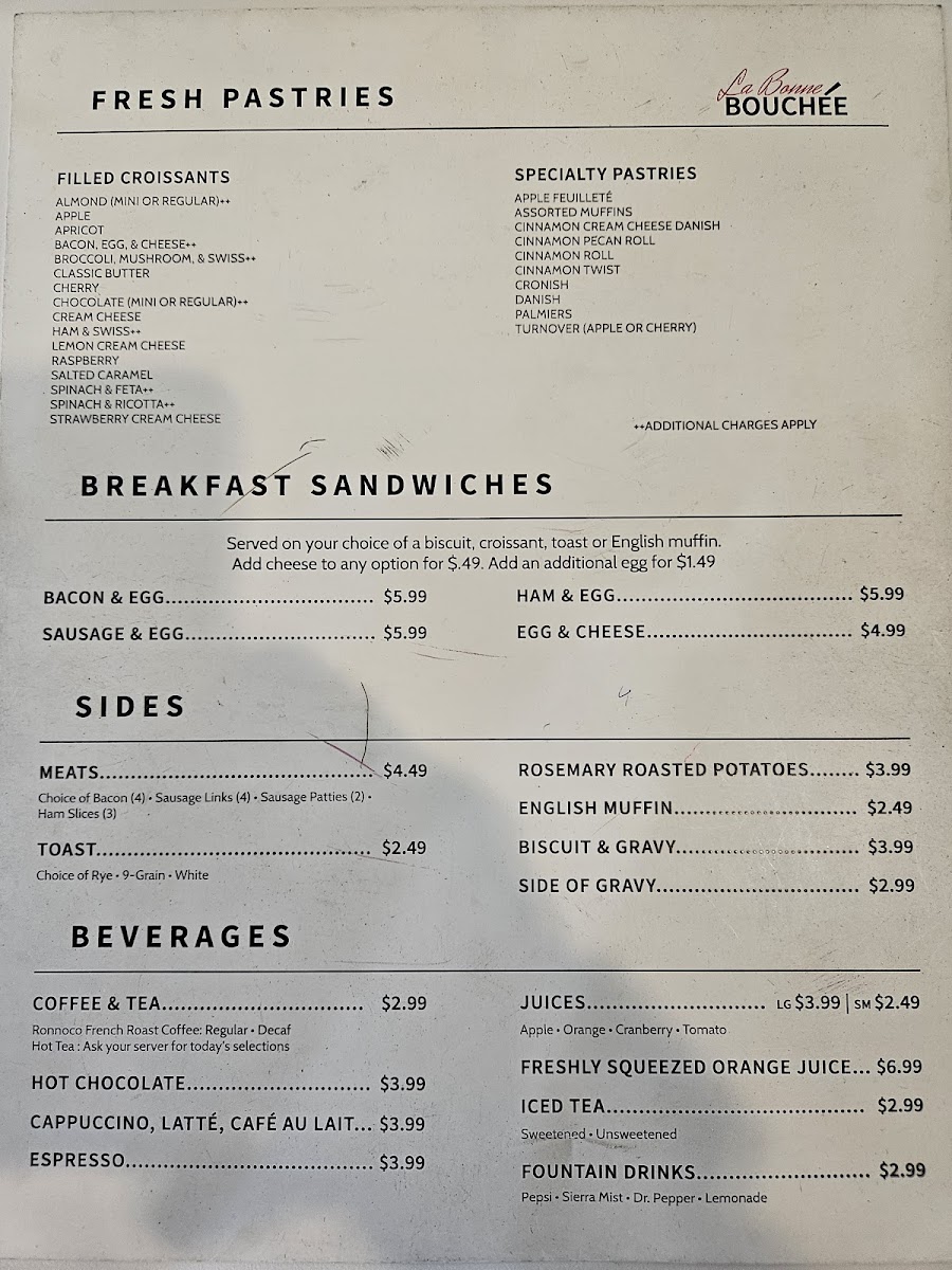 The menu at La Bonne Bouchée Patisserie & Cafe offers a variety of items suitable for breakfast, lunch, coffee breaks, and casual dining. It is divided into distinct sections covering bakery pastries, entrées, desserts, and to-go options.