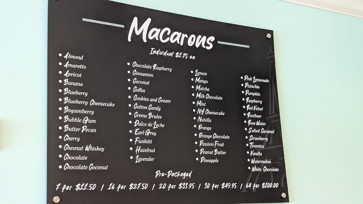 Desserts: Dessert options showcased on the menu range from traditional French pastries and cakes to individual delicacies such as macarons, fruit cakes, German chocolate cake, key lime pie, raspberry lemon cake, and seasonal cakes including wedding and four-flavour cake. Other sweet treats include crème brûlée and various specialty pies.